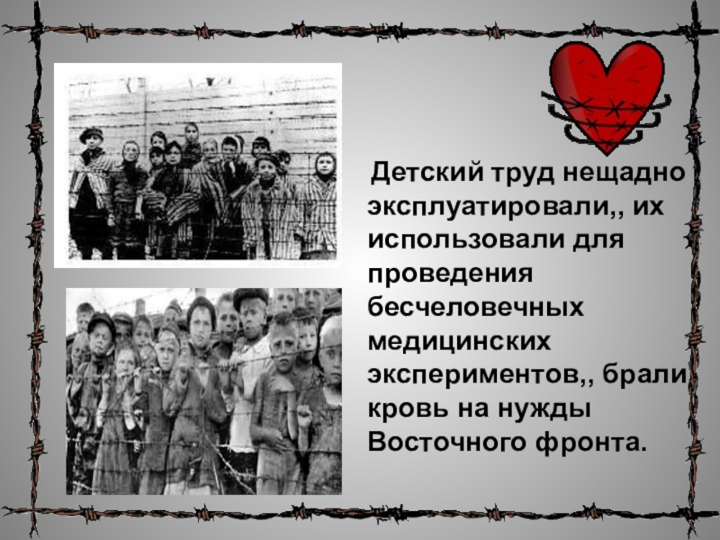 Слайд 53 Детский труд нещадно эксплуатировали,, их использовали для проведения бесчеловечных медицинских