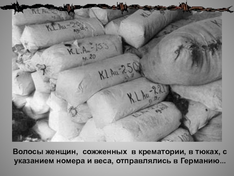 Слайд 25Волосы женщин, сожженных в крематории, в тюках, с указанием номера и
