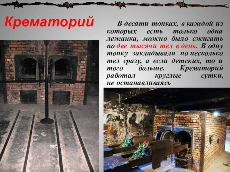 одна лежанка, можно было сжигать по две тысячи тел в день. В одну топку закладывали по несколько тел сразу, а если детских, то и того больше. Крематорий работал круглые сутки, не останавливаясь