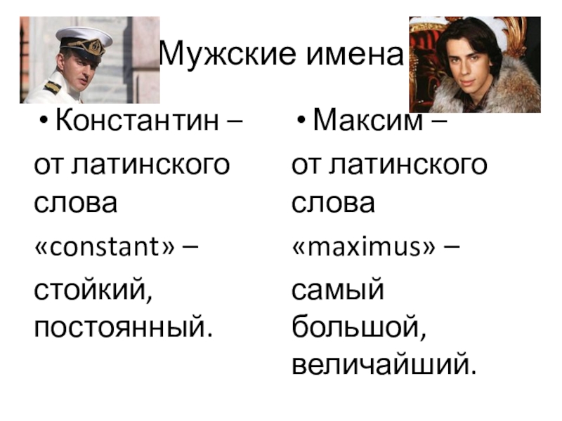 Мужские именаКонстантин – от латинского слова «constant» – стойкий, постоянный. Максим – от латинского слова «maximus» –