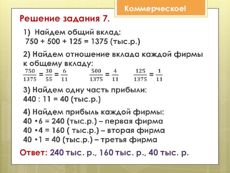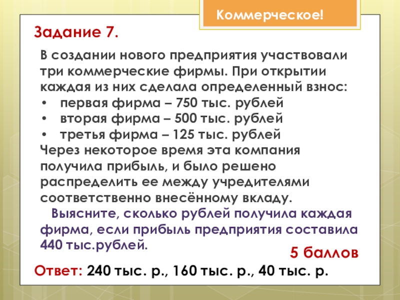 Ответ: 240 тыс. р., 160 тыс. р., 40 тыс. р.