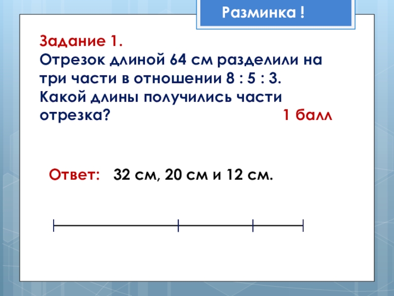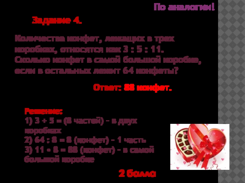 2) 64 : 8 = 8 (конфет) – 1 часть