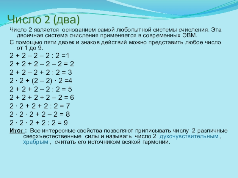 Итог : Все интересные свойства позволяют приписывать числу 2 различные сверхъестественные силы и называть число 2 духочувствительным , храбрым , считать его источником всякой гармонии.