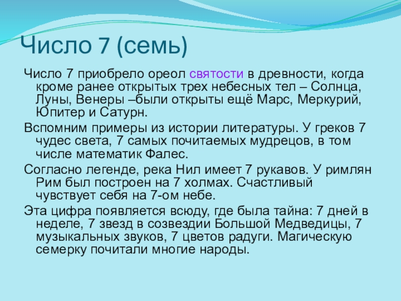Согласно легенде, река Нил имеет 7 рукавов. У римлян Рим был построен на 7 холмах. Счастливый чувствует себя на 7-ом небе.
