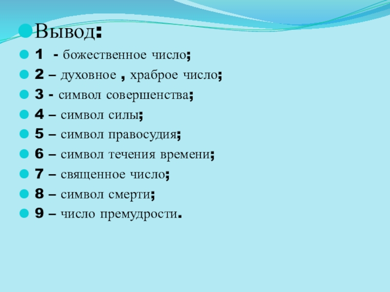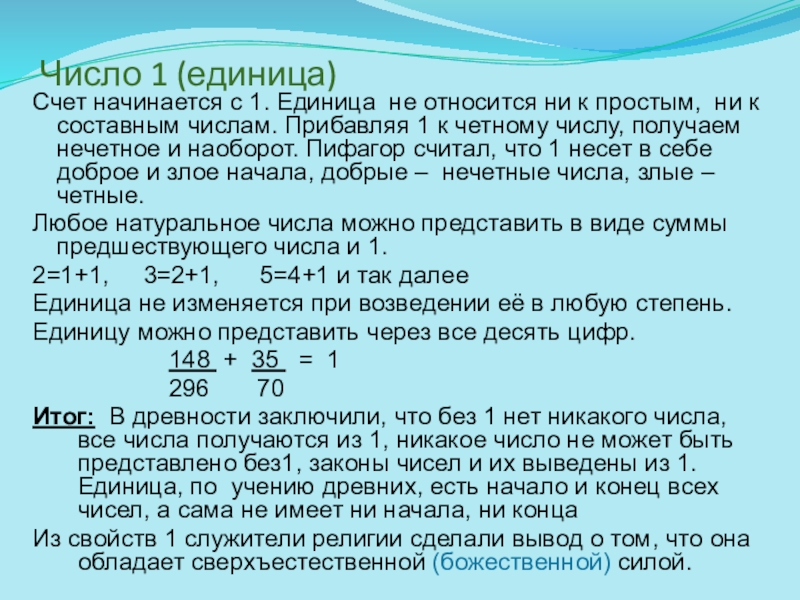 Итог: В древности заключили, что без 1 нет никакого числа, все числа получаются из 1, никакое число не может быть представлено без1, законы чисел и их выведены из 1. Единица, по учению древних, есть начало и конец всех чисел, а сама не имеет ни начала, ни конца
