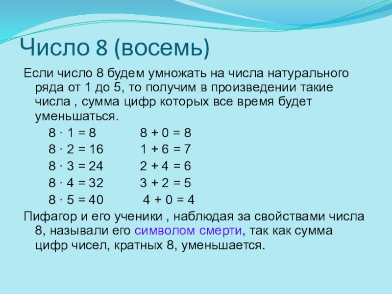 Пифагор и его ученики , наблюдая за свойствами числа 8, называли его символом смерти, так как сумма цифр чисел, кратных 8, уменьшается.