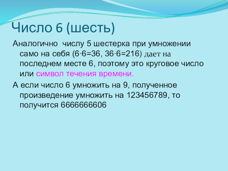 (6∙6=36, 36∙6=216) дает на последнем месте 6, поэтому это круговое число или символ течения времени.