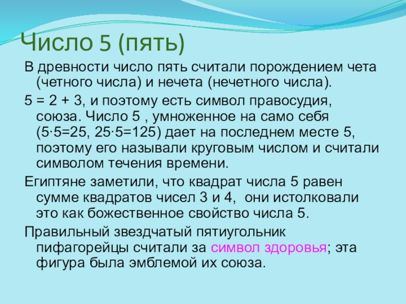 5 = 2 + 3, и поэтому есть символ правосудия, союза. Число 5 , умноженное на само себя (5∙5=25, 25∙5=125) дает на последнем месте 5, поэтому его называли круговым числом и считали символом течения времени.
