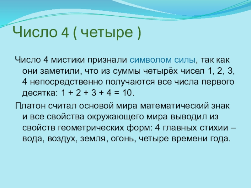 Платон считал основой мира математический знак и все свойства окружающего мира выводил из свойств геометрических форм: 4 главных стихии – вода, воздух, земля, огонь, четыре времени года.