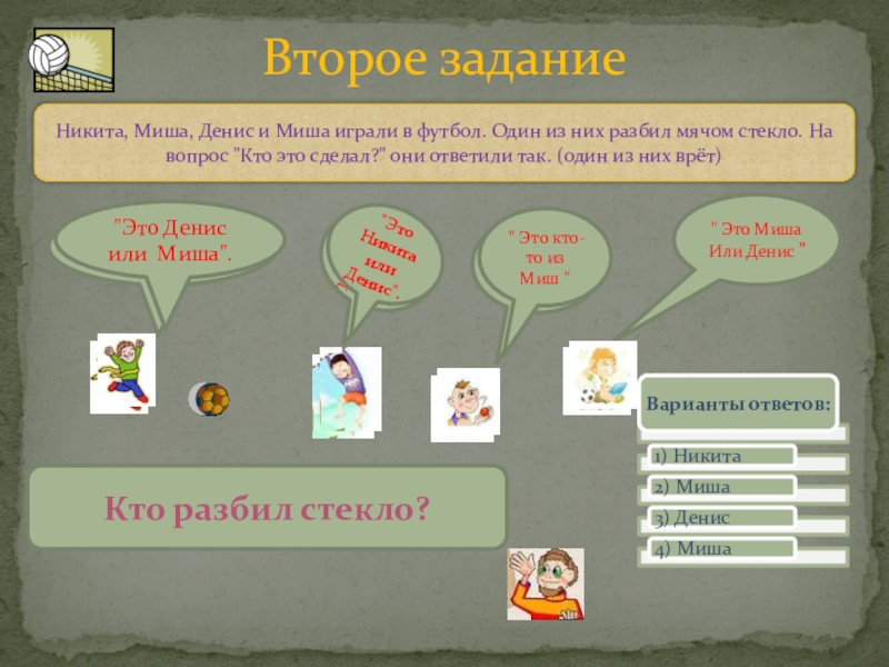 Никита, Миша, Денис и Миша играли в футбол. Один из них разбил мячом стекло. На вопрос "Кто это сделал?" они ответили так. (один из них врёт)