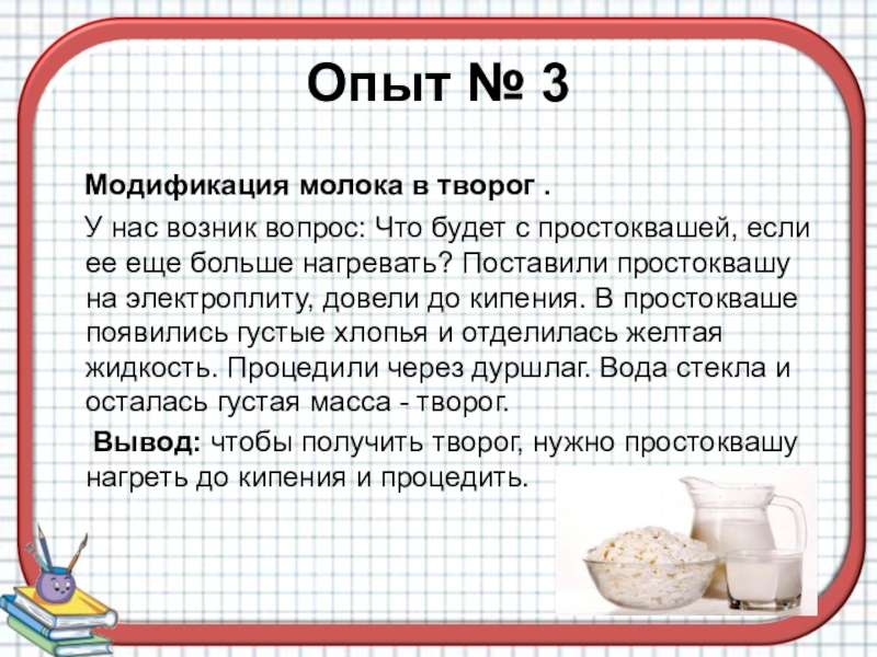 Вывод: чтобы получить творог, нужно простоквашу нагреть до кипения и процедить.