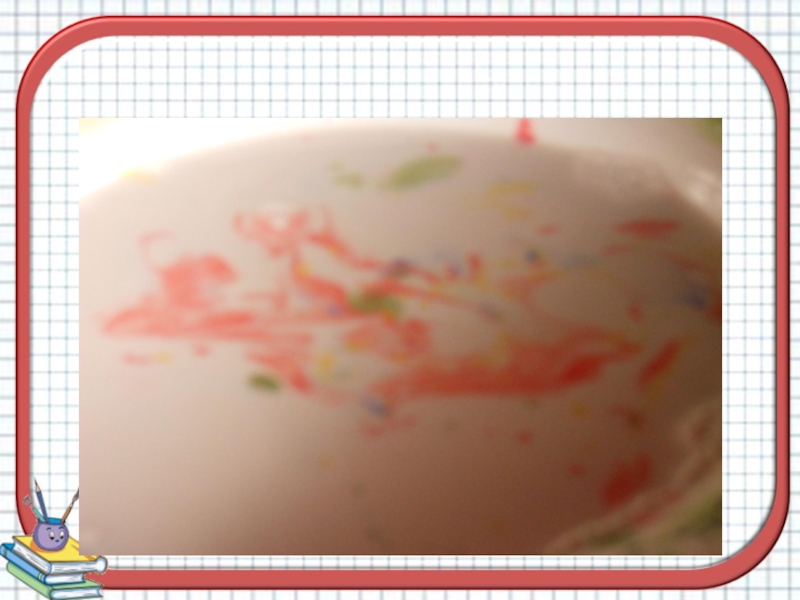 Налили молоко в плоскую тарелку. Капнули на молоко в нескольких местах гуашь разного цвета. Ватную палочку обмакнули в средство. Жидкость для мытья посуды заставляет молоко и краситель смешиваться, в результате на поверхности молока получились красивые цветные завитки.