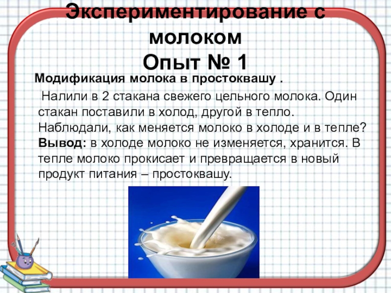 Налили в 2 стакана свежего цельного молока. Один стакан поставили в холод, другой в тепло. Наблюдали, как меняется молоко в холоде и в тепле? Вывод: в холоде молоко не изменяется, хранится. В тепле молоко прокисает и превращается в новый продукт питания – простоквашу.