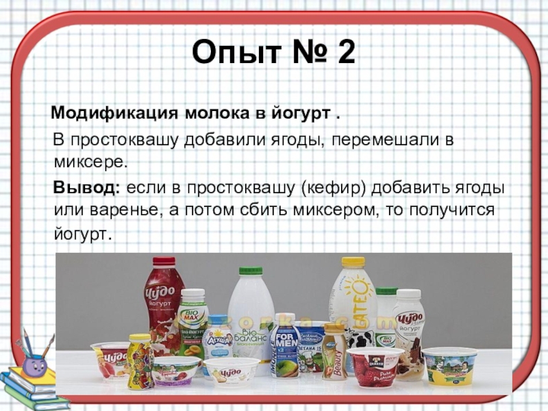 Вывод: если в простоквашу (кефир) добавить ягоды или варенье, а потом сбить миксером, то получится йогурт.