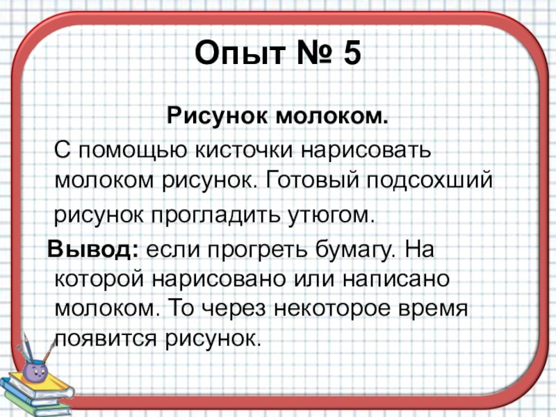 Вывод: если прогреть бумагу. На которой нарисовано или написано молоком. То через некоторое время появится рисунок.