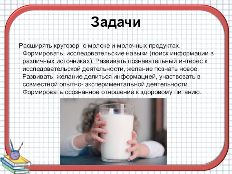 Расширять кругозор о молоке и молочных продуктах. Формировать исследовательские