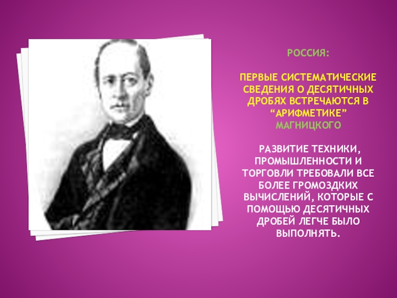 Россия:  первые систематические сведения о десятичных дробях встречаются в “Арифметике” Магницкого   Развитие техники, промышленности