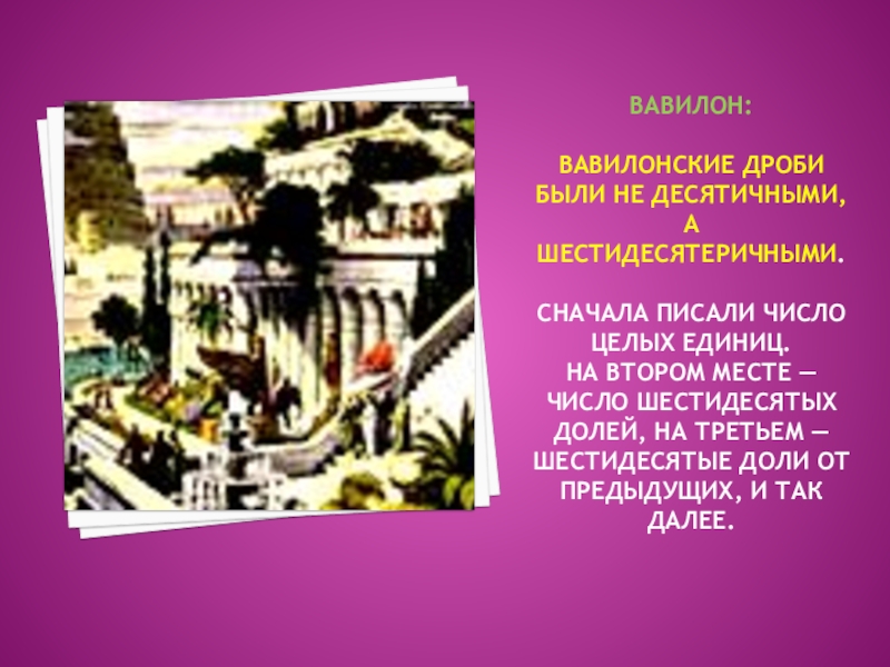 Слайд 3Вавилон: Вавилонские дроби были не десятичными, а шестидесятеричными. Сначала писали число целых