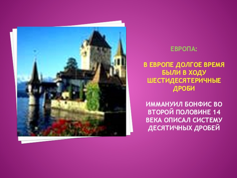 Слайд 6Европа: В Европе долгое время были в ходу шестидесятеричные дроби Иммануил Бонфис Во