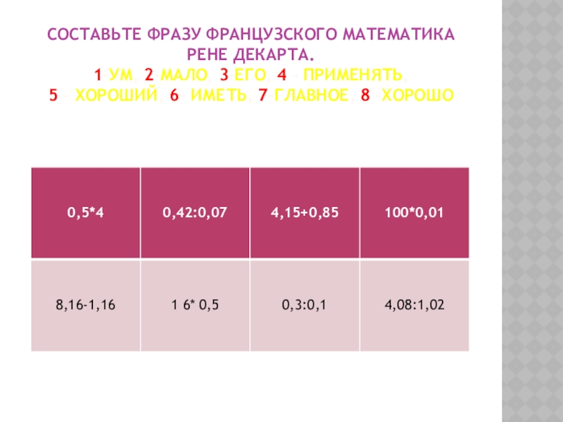 Слайд 10 Составьте фразу французского математика Рене Декарта. 1-ум, 2-мало, 3-его, 4 – применять,