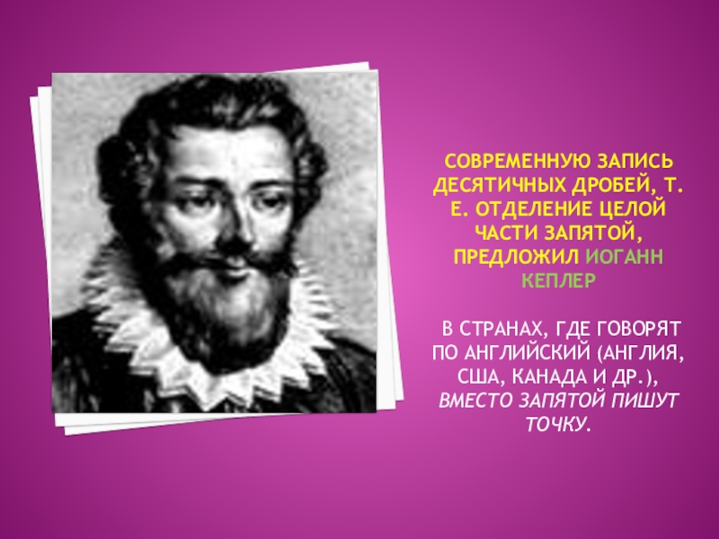 Современную запись десятичных дробей, т.е. отделение целой части запятой, предложил Иоганн Кеплер   В странах, где