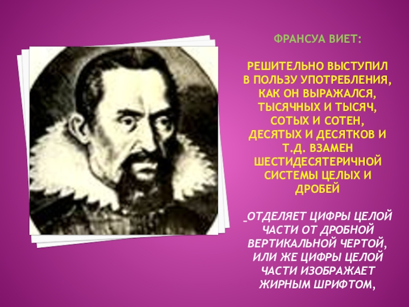 Слайд 7Франсуа Виет: решительно выступил в пользу употребления, как он выражался, тысячных