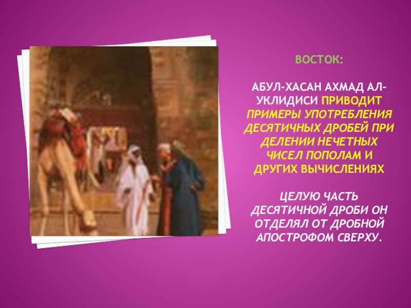 Слайд 4Восток: Абул-Хасан Ахмад Ал-Уклидиси приводит примеры употребления десятичных дробей при делении нечетных