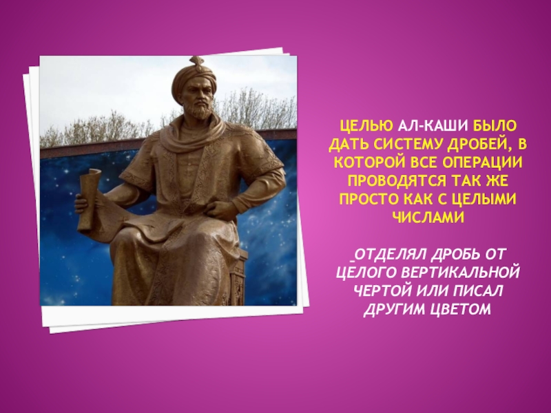 Целью Ал-Каши было дать систему дробей, в которой все операции проводятся так же просто как с целыми