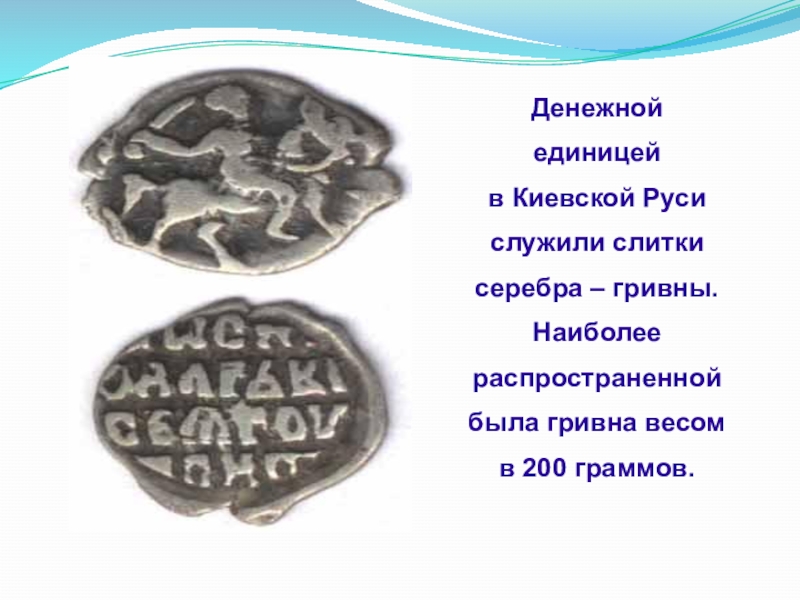 в Киевской Руси служили слитки серебра – гривны. Наиболее