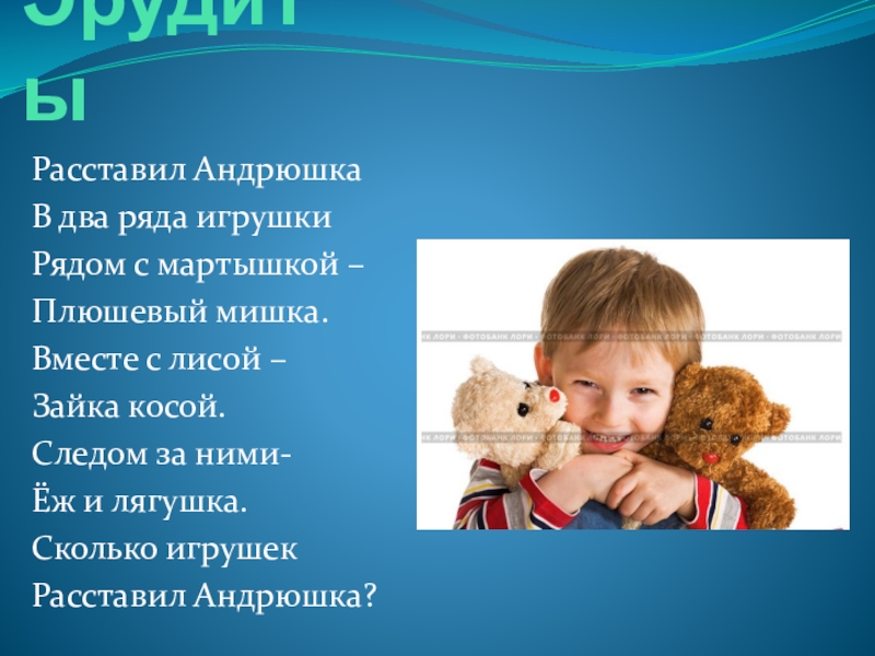 ЭрудитыРасставил Андрюшка В два ряда игрушкиРядом с мартышкой – Плюшевый мишка.Вместе с лисой – Зайка косой.Следом за
