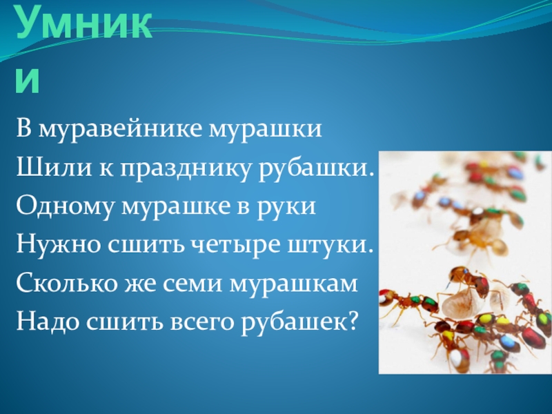 УмникиВ муравейнике мурашкиШили к празднику рубашки.Одному мурашке в рукиНужно сшить четыре штуки.Сколько же семи мурашкамНадо сшить всего