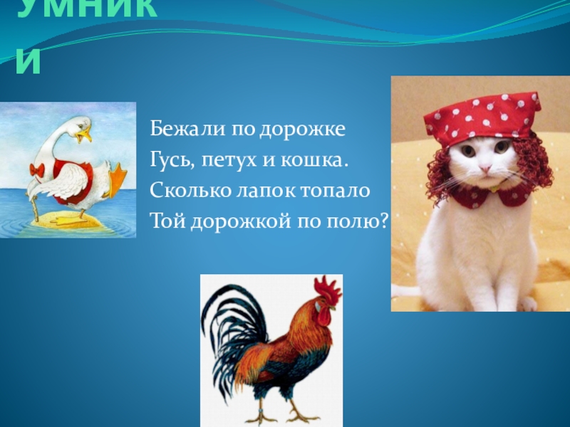 УмникиБежали по дорожкеГусь, петух и кошка.Сколько лапок топалоТой дорожкой по полю?