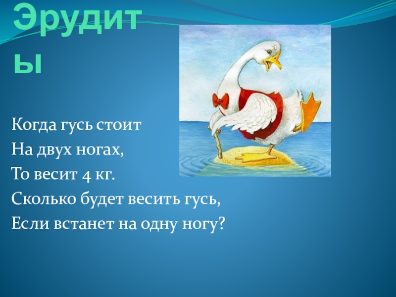ЭрудитыКогда гусь стоитНа двух ногах,То весит 4 кг.Сколько будет весить гусь,Если встанет на одну ногу?