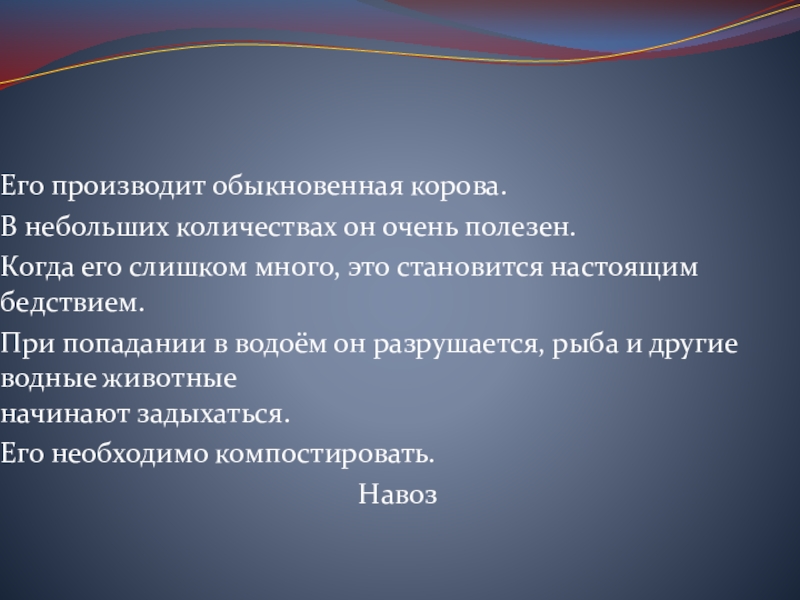 Его производит обыкновенная корова. В небольших количествах он очень полезен. Когда его слишком много, это становится настоящим бедствием. При попадании в водоём он разрушается, рыба и другие водные животные начинают задыхаться. Его необходимо компостировать. Навоз