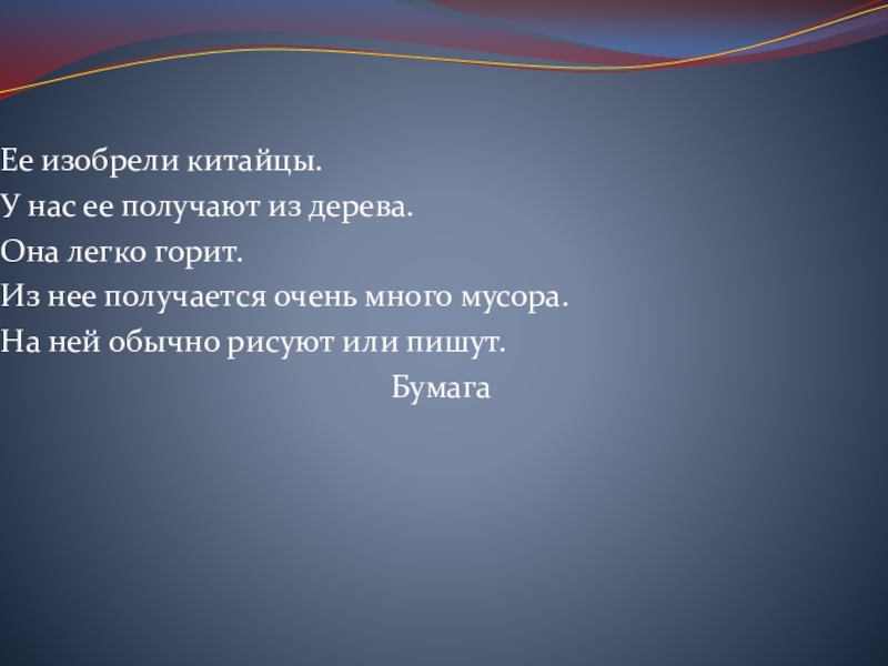 Ее изобрели китайцы. У нас ее получают из дерева. Она легко горит. Из нее получается очень много