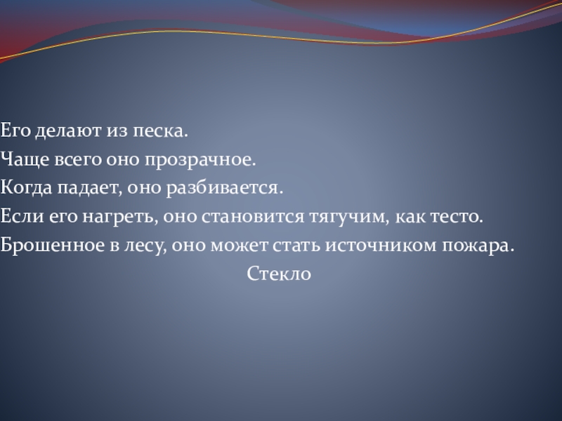 Его делают из песка. Чаще всего оно прозрачное. Когда падает, оно разбивается. Если его нагреть, оно становится