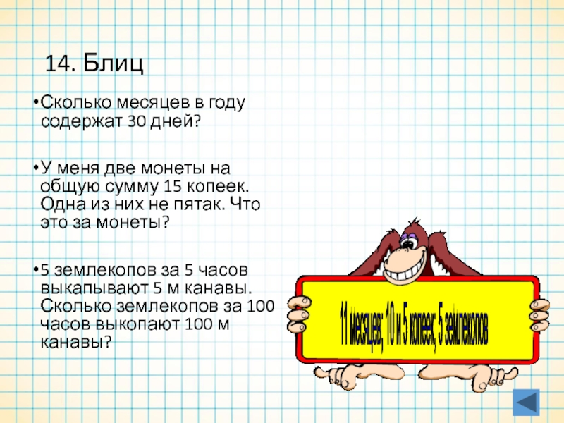 11 месяцев; 10 и 5 копеек; 5 землекопов