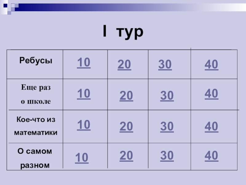 I тур 10101010202020203030303040404040Кое-что изматематикиЕще разо школеРебусыО самом разном