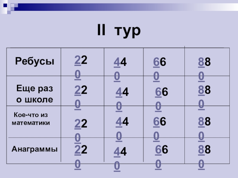 II тур 220220220220440440440440660660660660880880880880РебусыЕще разо школеКое-что изматематикиАнаграммы