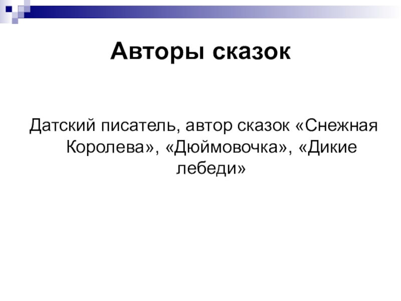 Авторы сказокДатский писатель, автор сказок «Снежная Королева», «Дюймовочка», «Дикие лебеди»