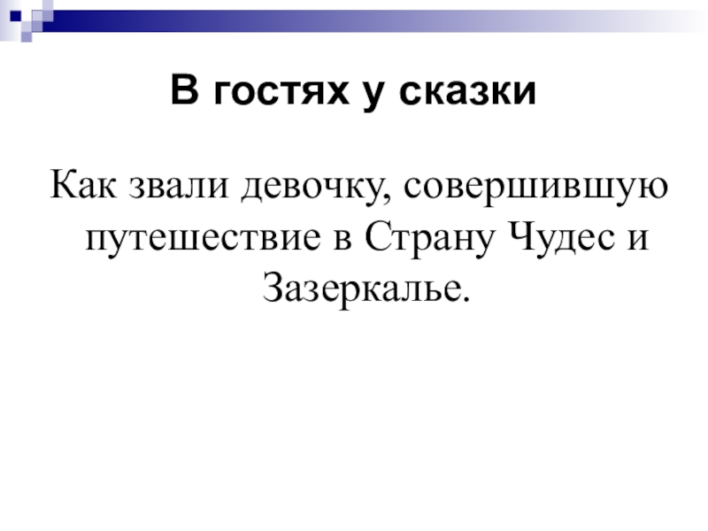 В гостях у сказкиКак звали девочку, совершившую путешествие в Страну Чудес и Зазеркалье.