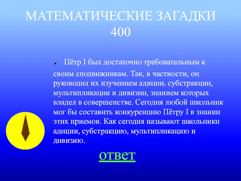 . Пётр I был достаточно требовательным к своим сподвижникам. Так, в частности, он руководил их изучением адиции, субстракции, мультипликации и дивизии, знанием которых владел в совершенстве. Сегодня любой школьник мог бы составить конкуренцию Пётру I в знании этих приемов. Как сегодня называют школьники адиции, субстракцию, мультипликацию и дивизию.