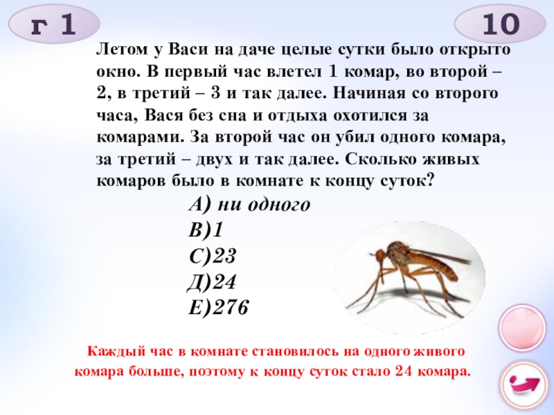 Каждый час в комнате становилось на одного живого комара больше, поэтому к концу суток стало 24 комара.