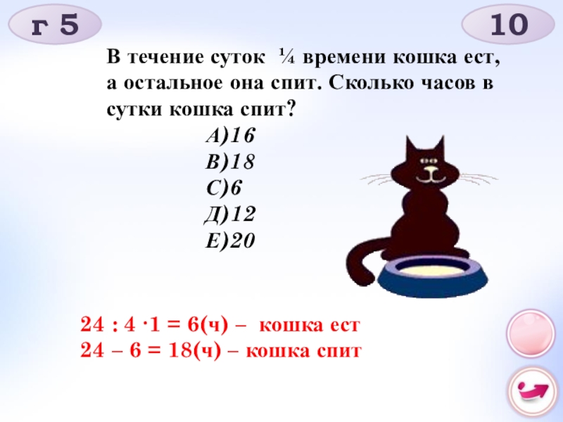 24 : 4 ∙1 = 6(ч) – кошка ест
