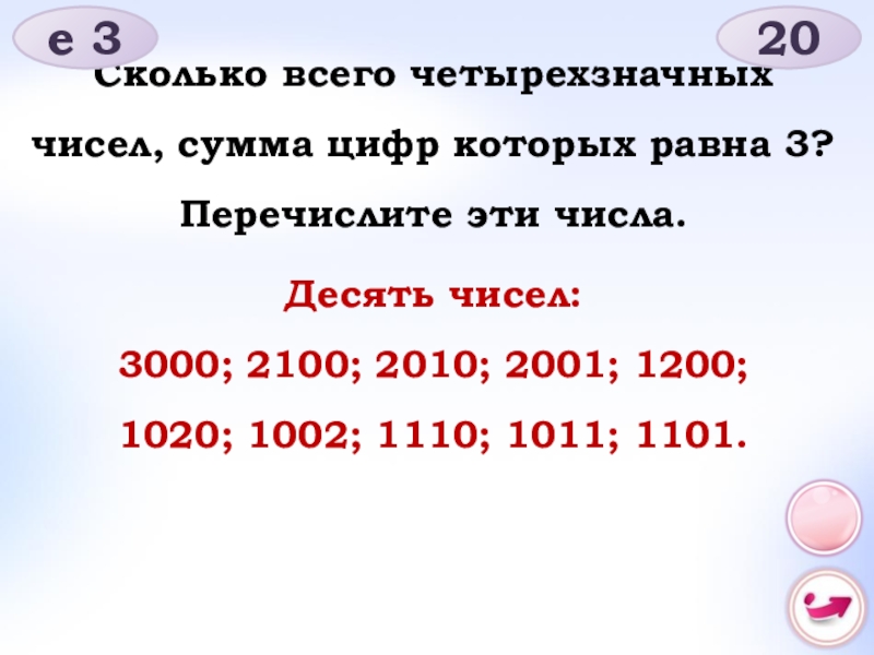 3000; 2100; 2010; 2001; 1200; 1020; 1002; 1110; 1011; 1101.