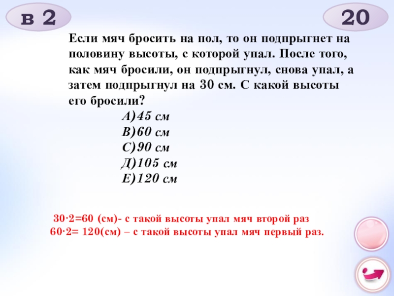 60∙2= 120(см) – с такой высоты упал мяч первый раз.