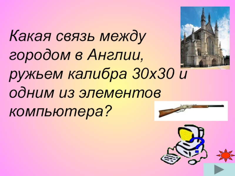 Слайд 18Какая связь между городом в Англии, ружьем калибра 30х30 и одним