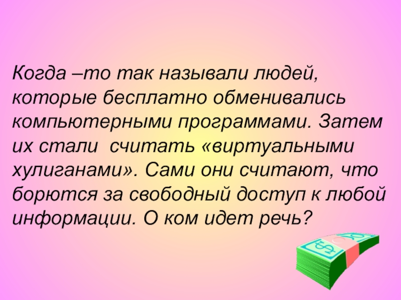 Слайд 19Когда –то так называли людей, которые бесплатно обменивались компьютерными программами. Затем