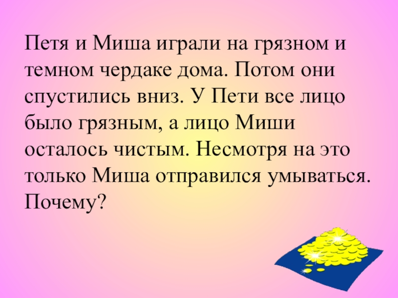 Слайд 12Петя и Миша играли на грязном и темном чердаке дома. Потом