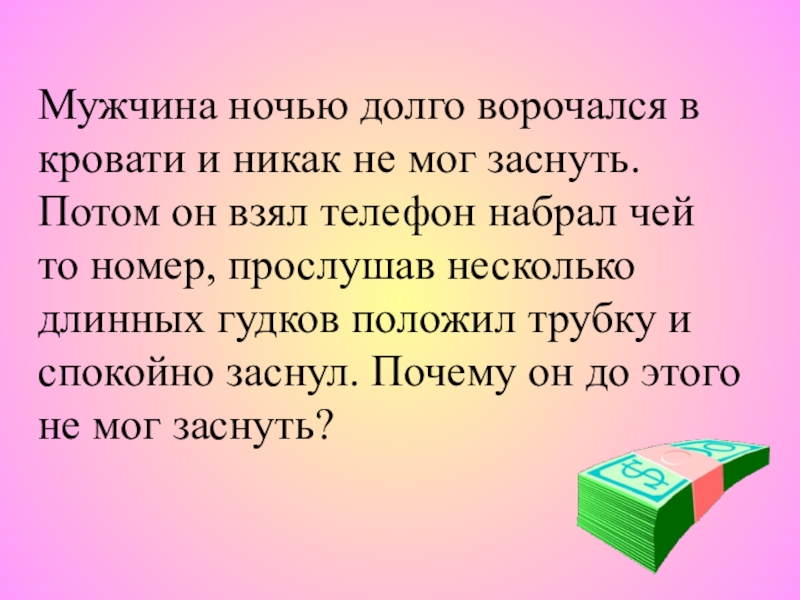 Слайд 11Мужчина ночью долго ворочался в кровати и никак не мог заснуть.